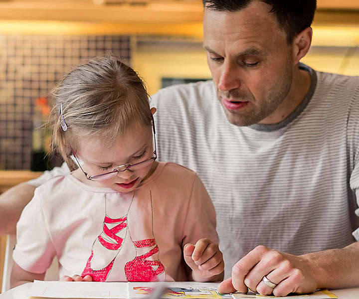 A father and young daughter reading together